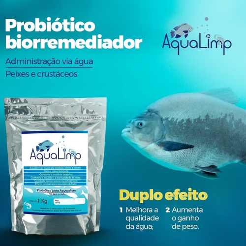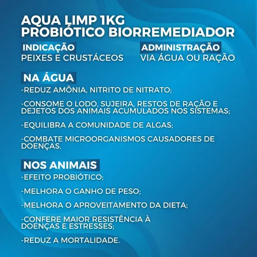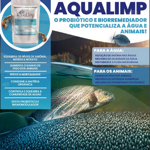 AquaLimp é um probiótico com atividade biorremediadora de aplicação via água ou ração, sua fórmula é altamente concentrada em bactérias benéficas, é compatível com peixes e crustáceos.